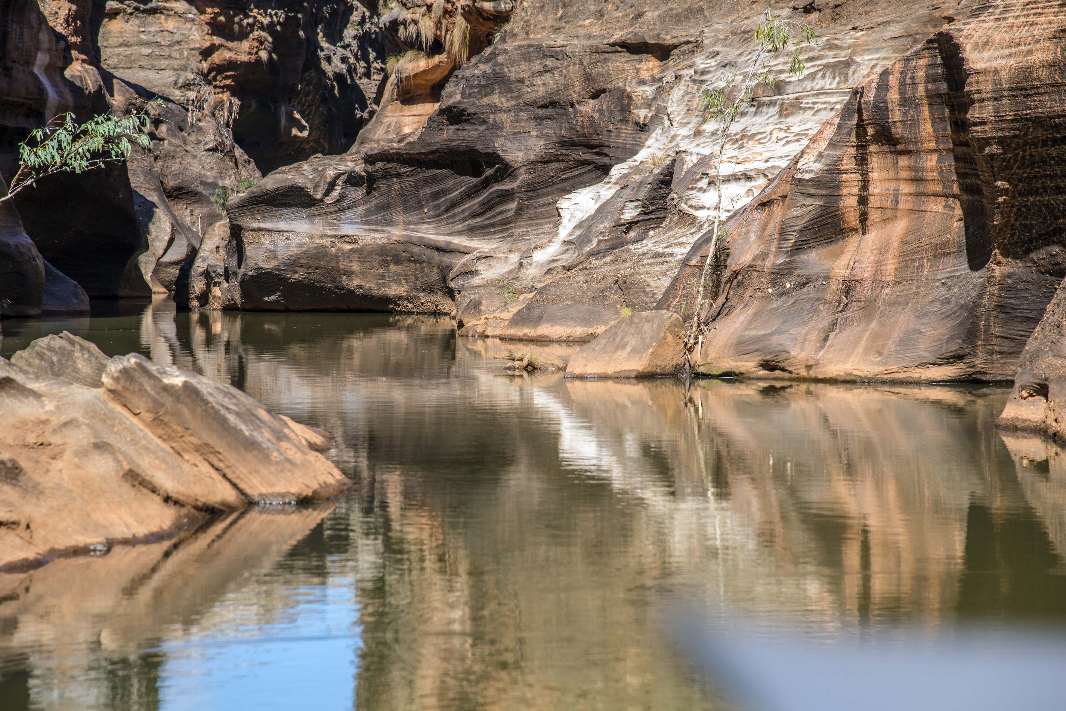 Next was our trip up the very narrow gorge in an electric pontoon about 6 foot wide. As it was so quiet we were able to sneak up on Clyde the Freshwater Crocodile, sunning himself!