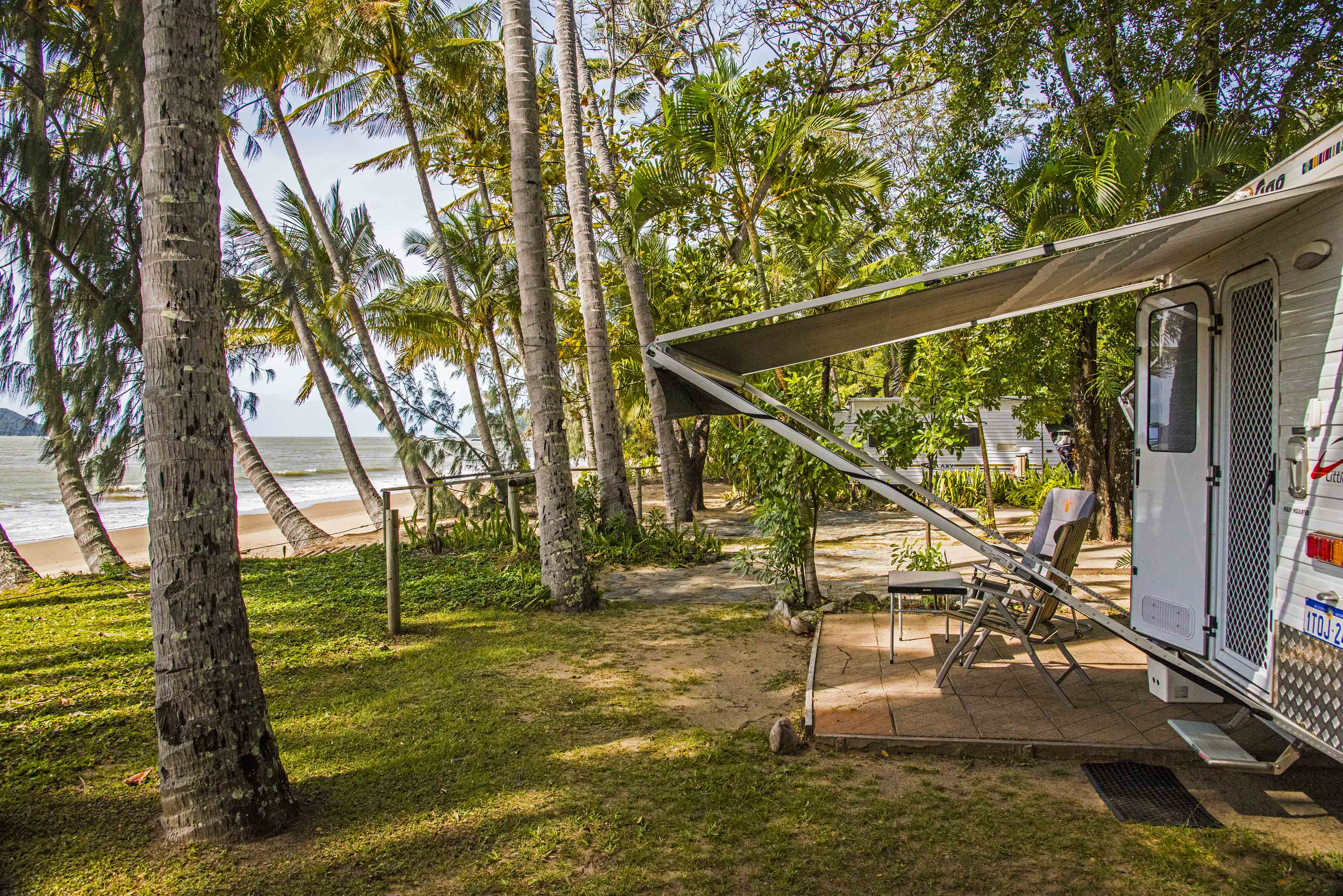 We are now at Ellis Beach until 7 July when we head into Cairns for the van to be serviced (done 10000 k’s!) Here is the view through our caravan door – a lovely beachfront spot as we got a last minute cancellation (it’s the caravanner’s version of winning Lotto as people book for 2-3 years ahead for this slice of paradise). Within walking distance there is good food at the local bar and grill ($1 oysters on Sundays so Ginny is in hog heaven) and great beach walks…
