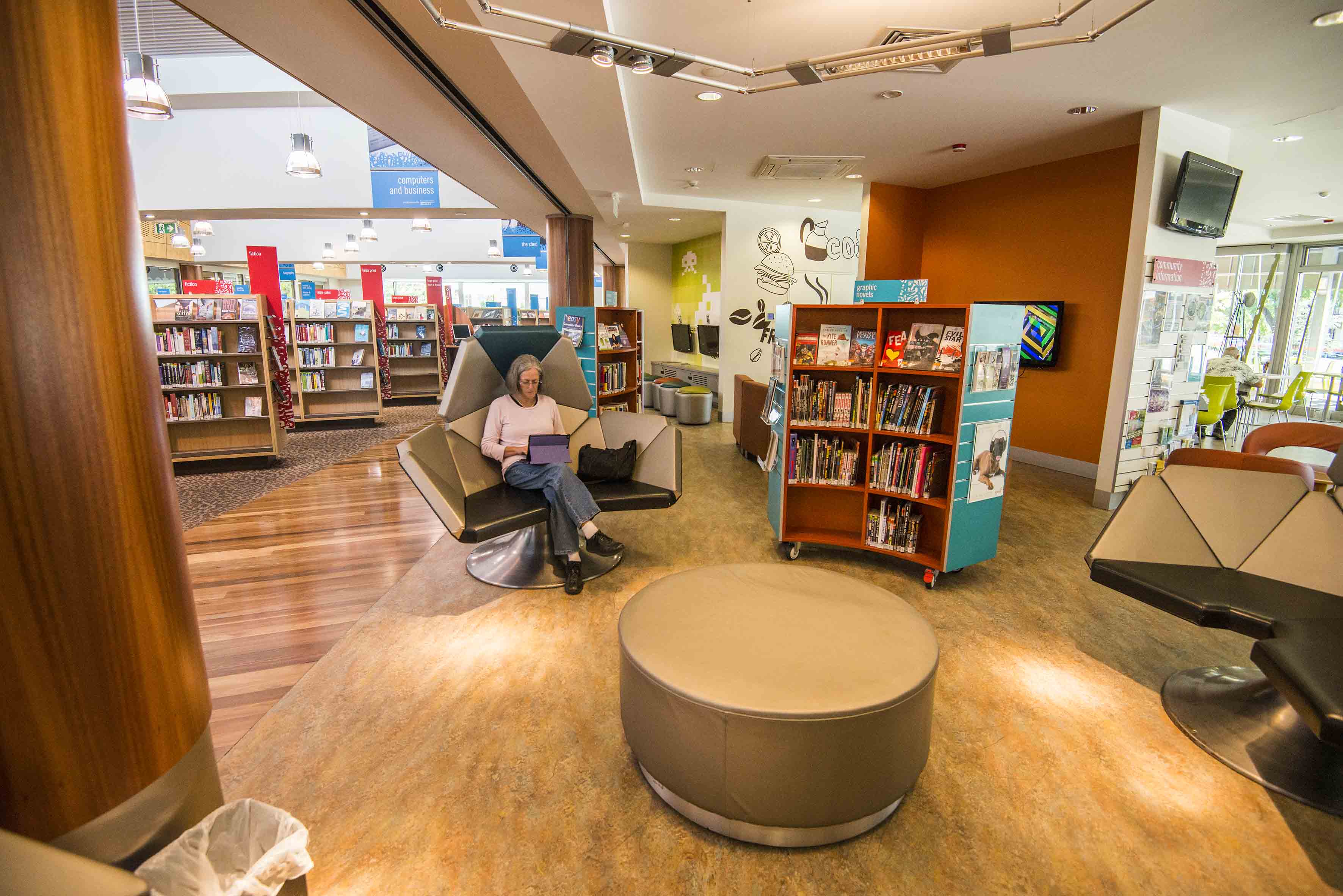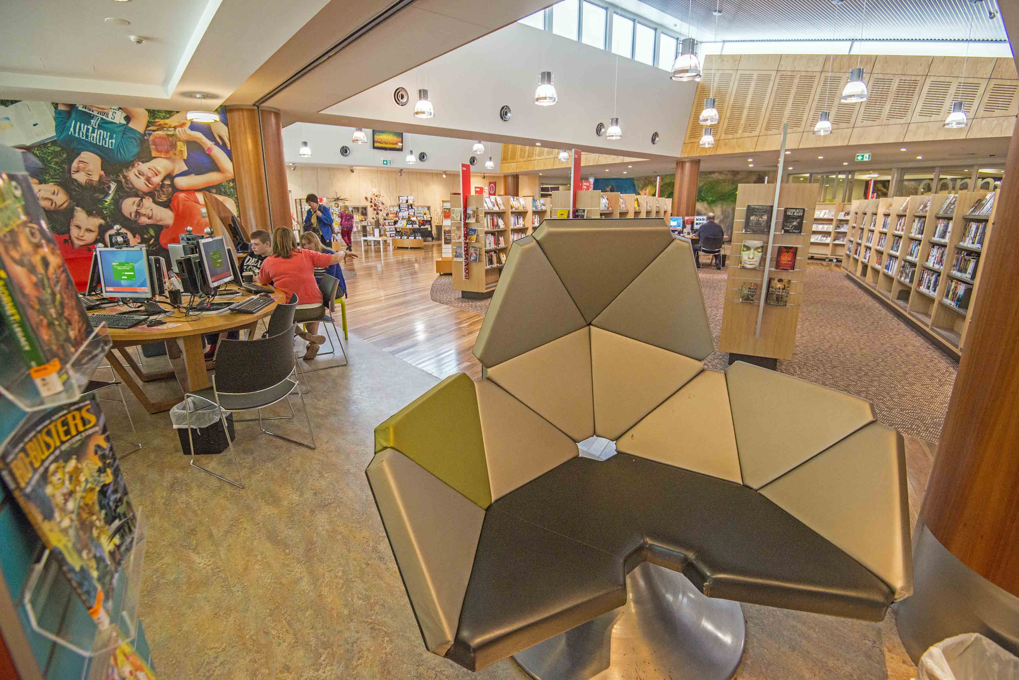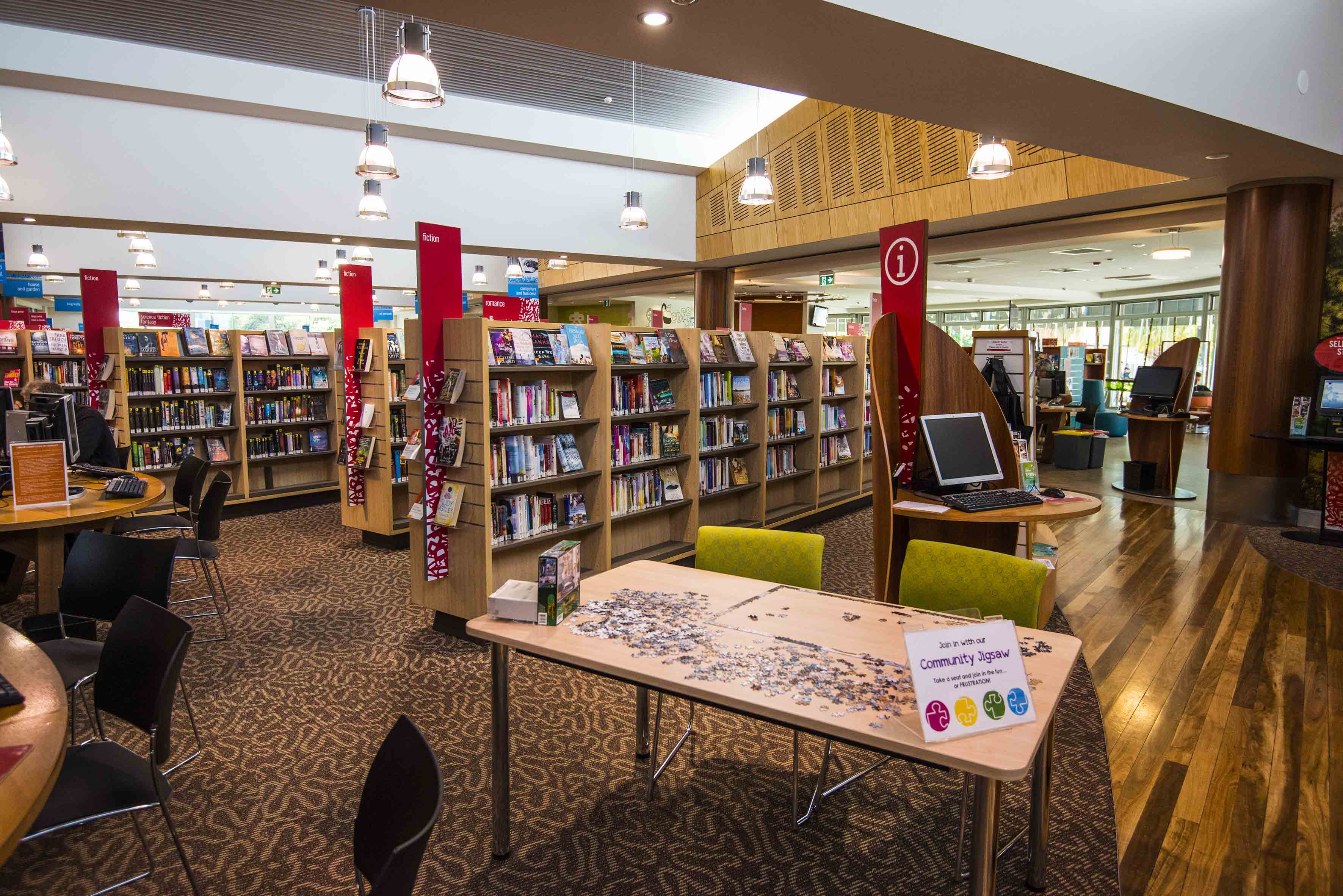 Next door is the public library. Wow, we want one! Top technology, amazing displays, children’s section, study and training rooms – and of course a cafe just in case you need a coffee hit. Ginny LOVED their techie chairs, designed to fit more than one person – complete with 240volts outlet to keep your Macbook Pro charged! And check out the community jigsaw below.