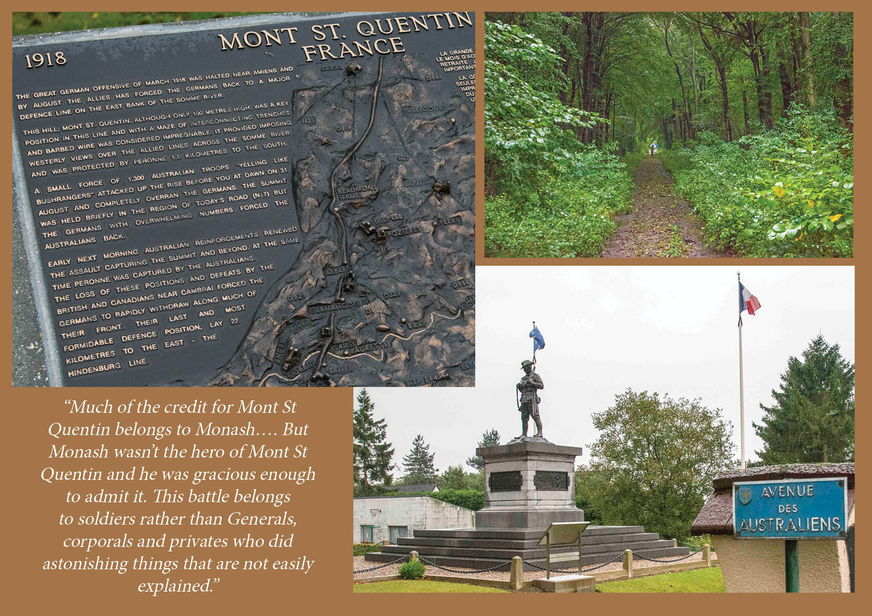 Les Carlyon in his book The Great War has described Mont St Quentin: “Much of the credit for Mont St Quentin belongs to Monash…. But Monash wasn’t the hero of Mont St Quentin, and he was gracious enough to admit it. This battle belongs to soldiers rather than Generals, corporals and privates who did astonishing things that are not easily explained.” Six Victoria Crosses were awarded in one day – the first of September…